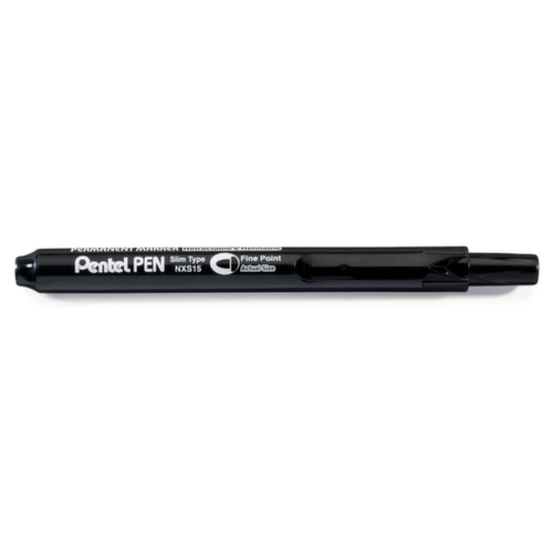 "longDescription": "<h2>Permanent Marker mit Druckmechanik schwarz</h2><p>Der Permanent Marker von Pentel schreibt auf den unterschiedlichsten Oberflächen wie Papier, Holz, Kunststoff oder Glas. Dank Druckmechanik mit Safety-Click zieht sich die Mine beim Einstecken automatisch zurück, wodurch Sie unschöne Flecken vermeiden. Weitere Details im Überblick: - Marker besteht aus einem Kunststoff-Gehäuse - Mit Befestigungsclip - Tinte auf Alkoholbasis- Wasserfest und lichtecht- Feine Rundspitze - Strichbreite: 1mm</p><br>",