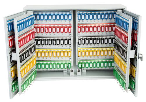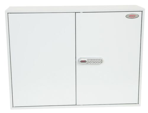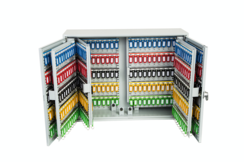 Hakenleisten verstellbar, nummeriert und in verschiedenen Farben. Die farbigen Schlüsselringe und Anhänger sorgen für einen aufgeräumten Schrankinhalt und Überblick. Staubgeschützt zu schließen über Doppel-Flügeltür. Verschließbar mit elektronischem Codeschloss, das mit einem eigenen 4-stelligen Benutzercode programmiert werden und nach Bedarf einfach geändert werden kann. Konstruktion aus Stahl. Korpus mit schlag- und kratzfester Pulverbeschichtung in grau. Front mit schlag- und kratzfester Pulverbeschichtung in grau. Vorbereitet zur Rückwandverankerung.