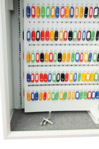 Ausgestattet mit einer Schlüsselüberbrückungseinrichtung zur Sicherheit, falls der Code verlegt wird. Die farbigen Schlüsselringe und Anhänger sorgen für einen aufgeräumten Schrankinhalt und Überblick. Flügeltür. Verschließbar mit manipulationssicherem Elektronikschloss. Konstruktion aus Stahl. Korpus mit kratzfester Beschichtung in RAL9003 Signalweiß. Front mit kratzfester Beschichtung in RAL9003 Signalweiß. Vorbereitet zur Rückwandverankerung.