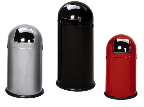 "longDescription": "<h2>Push- und Tretabfalleimer</h2><strong>einfache Entleerung durch seitliche Griffmulden</strong><br><ul><li><strong>Geruchssicher und hygienisch</strong> - selbstschließende Einwurfklappe aus poliertem Edelstahl</li><li><strong>Bodenschonend</strong> - mit Bodenring aus Kunststoff</li><li><strong>Leicht zu reinigen</strong> - herausnehmbarer Innenbehälter aus verzinktem Stahl mit Griffen</li></ul><br><strong>Sie haben die Wahl:</strong><br><ul><li><strong>Per Hand oder Fuß</strong> - Deckelöffnung manuell oder per Tretpedal</li><li><strong>Auffällig oder elegant</strong> - aus Stahlblech mit farbiger Pulverbeschichtung oder aus Edelstahl</li></ul><br>Durch seine Optik ist dieser Mülleimer im Retro-Look ein Blickfang und passt sowohl ins Büro als auch in repräsentative Bereiche wie Foyer, Empfangsbereiche oder Verkaufsräume. Der Abfalleimer hat eine Garantie von 3 Jahren. <br><br>Die Einwurfklappe aus Edelstahl ist durch ihr Material abwischbar und leicht hygienisch sauber zu halten. Seitliche Griffmulden ermöglichen ein bequemes Anheben zur einfachen Entleerung des Abfalleimers. Für den Fußbodenschutz sorgt ein breiter Bodenring aus Kunststoff.<br>",