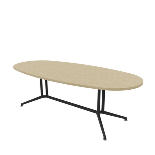 Form oval. V-Formgestell aus Stahl mit Epoxidpulverbeschichtung in dunkelgrau. Vierkant- und Rundrohr. Gestell mit nivellierbaren Kunststoffgleitern, mit denen sich Bodenunebenheiten optimal ausbessern lassen. Platte aus Holzwerkstoffplatte mit abriebfester und feuchtigkeitsbeständiger Melaminbeschichtung in Dekor Eiche. Plattenstärke 30 mm. Kante mit schlagfestem ABS-Umleimer, der vor unschönen Rissen und Ausbrechen schützt. Plattenkante in Eiche. Traversen mit Epoxidpulverbeschichtung.