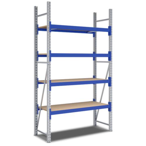 Die wichtigsten Maße des Weitspannregals auf einen Blick:4 Ebene(n) mit Holzboden. Fachhöhen je nach Einsatzzweck und Ihrem Bedarf im Raster von 50 mm verstellbar. Konstruktion aus Stahl, Ständer mit korrosionsschützender Zinkbeschichtung, Traversen mit strapazierfähiger Kunststoffbeschichtung in RAL5010 Enzianblau. Ständer mit Fußplatte (dübelfähig).