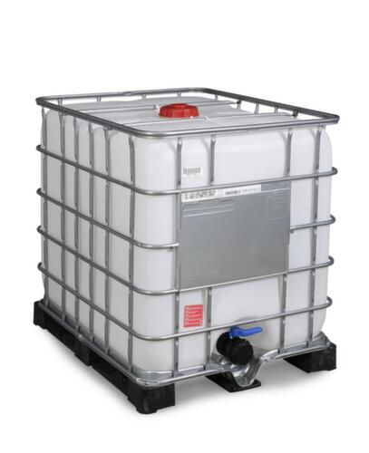Für die ordnungsgemäße Lagerung wassergefährdender und ätzender Stoffe. Die Oberfläche des Containers ist UV-stabilisiert, womit sein Herstellungsmaterial selbst gegenüber schädlichen Einflüssen von UV-Licht geschützt ist. Durch den geschützt liegenden Auslaufhahn NW 80, dessen Zulauföffnung zusätzlich mit einer Alu-PE-Scheibe versiegelt ist, wird die Sicherheit des Inhalts sowie ein Schutz vor Leckagen gewährleistet. Aus Hochdruck-Polyethylen in transparent. Mit Polyethylenpalette. Mit Schraubdeckel. Verschließbar mit Plomben. Durch Gitterrahmen stapelbar.