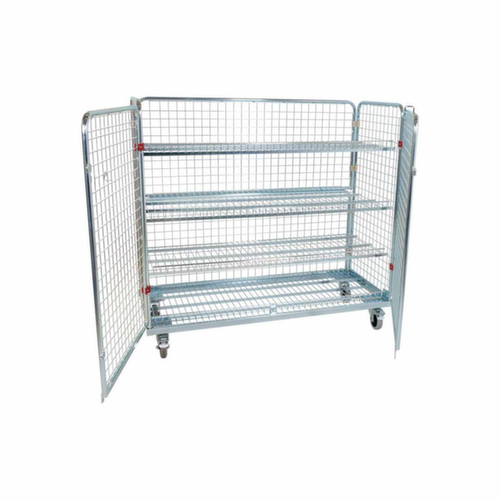 Aufbauten: 3 Wände (Drahtgitter), 1 Doppelflügeltür. Der Inhalt des Behälters ist vor unbefugtem Zugriff geschützt, da Sie ihn abschließen können. Gestell aus Stahl galvanisch blau verzinkt. Plattform aus Drahtgitter. Leicht zu manövrieren und verfahren durch 4 Lenkrollen. Die Feststeller an 2 Lenkrollen gewähren einen sicheren Stand. Rad Ø 125 mm. Mit bodenschonender Elastik-Bereifung auf Polyamid-Felge.