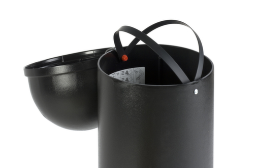 Der Entsorgungsbehälter ist feuerhemmend - bei aufgesetztem Kopfteil und geschlossener Einwurfklappe werden Flammen erstickt. Für den Einsatz im Innen- und geschützten Außenbereich.