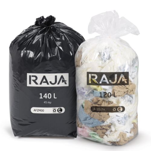 "longDescription": "<h2>Standard-Müllsäcke schwarz 45 µ, 700 x 1100 mm RAJA</h2><p>Gut geeignet für nahezu jede Art anfallenden Mülls in Gastronomie und Unternehmen: In Standard-Müllsäcken 45 µ, wahlweise schwarz oder transparent, können Restmüll, Küchenabfälle und Recyclingabfälle absolut sauber und hygienisch entsorgt werden. Dabei sind die Standard-Müllsäcke 45 µ aus LDPE durch die etwas reduzierte Folienstärke im Vergleich zu unseren Standard-Müllsäcken 60 µ ressourcenschonender hergestellt - und stecken dennoch ganz gut was weg: Die Standard-Müllsäcke 45 µ erhalten Sie in verschiedenen Größen von 30 l Volumen bis hin zu 140 l Volumen und in zwei Farbvarianten schwarz (blickdicht) oder transparent. Achtung: Die Lieferung der Müllbeutel erfolgt ohne Verschlussmittel oder Verschlussbänder - zum sicheren und hygienischen Verschließen empfehlen wir Kabelbinder, ein Stück Klebeband oder Driller. Ein guter Knoten tut es in den meisten Fällen aber auch Am umweltschonendsten ist immer: Müllvermeidung! Mit der richtigen Mülltrennung führen Sie die unvermeidbaren Abfälle dem Recycling zu. Bei der sauberen Entsorgung Ihrer Abfälle helfen Behälter für die Mülltrennung und ein intuitiv verständliches Farbsystem. Alle Details im Überblick: - Standard-Müllsäcke aus 45 µ starker LDPE Folie - Lieferung erfolgt auf der Rolle- Recyclinganteil 80 %, davon 50 % Post Consumer Abfälle- Leichte und dennoch robuste Variante zu den Standard-Müllsäcken 60 µ- In schwarz (blickdicht) oder transparent erhältlich- Lieferung ohne Verschlussmittel</p><br>",