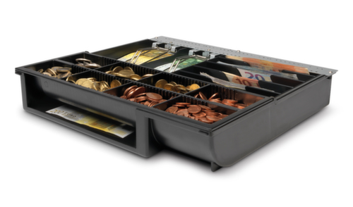 "longDescription": "<h2>Einsatz für Kassenschublade</h2><ul><li>Separates Bargeld-Fach als Ergänzung zur Kassenlade</li><li>Ideal für schnelle Schichtwechsel oder das schnelle Auswechseln voller Registrierkassen </li><li>Robuste Geldclips aus Metall</li><li>Individuelle Gestaltung mit einstellbaren Fächern für Banknoten und einem herausnehmbaren und einstellbaren Fach für 8 verschiedene Münzen</li><li>Mit Separierungsschlitz für die Lagerung von großen Scheinen und Wertpapieren außerhalb der Sichtweite</li></ul><br>1 Jahr Garantie<br><br>",