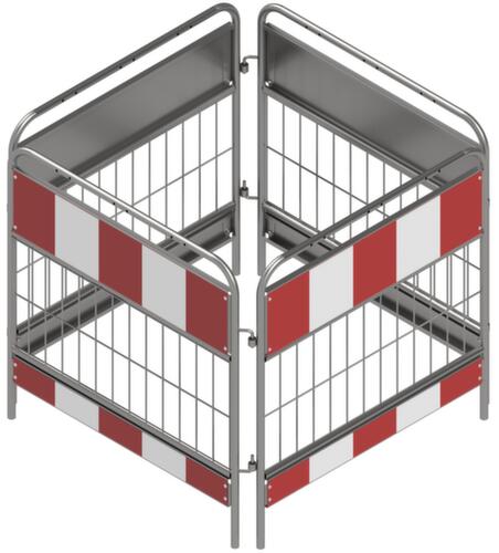 Merkmale:Aus Stahlrundrohr mit korrosionsschützender Zinkbeschichtung. Das eingeschweißte Gittergewebe schützt vor unbefugtem Durchstieg. Auf sich aufmerksam macht das Gitter durch die reflektierende Folierung in rot/weiß. Durch Hinzufügen von weiteren Gitterelementen kann das Schachtschutzgitter endlos erweitert werden.
