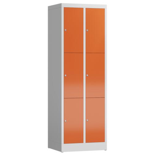 Flügeltür. Verschließbar mit Zylinderschloss. Konstruktion aus Stahl, verschweißt. Korpus mit elektrostatischer Pulverbeschichtung in RAL7035 Lichtgrau. Front mit elektrostatischer Pulverbeschichtung in RAL3000 Feuerrot.