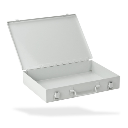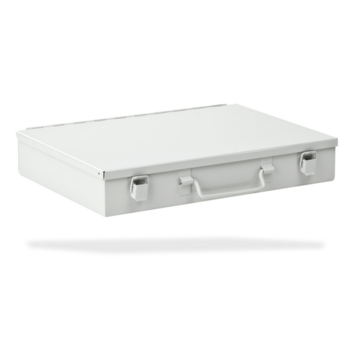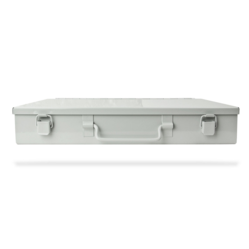 Verschließbar über 2 Spannverschlüssen. Mit Tragegriff. Koffer aus Stahlblech. Koffer mit schlag- und kratzfester Pulverbeschichtung in RAL7035 Lichtgrau.