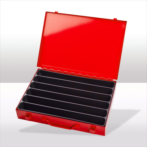 Verschließbar über 2 Spannverschlüssen. Ausgestattet mit herausnehmbarer Unterteilung mit gleich langen Fächern. Mit Tragegriff. Koffer aus Stahlblech / Kästen aus Kunststoff. Koffer mit schlag- und kratzfester Pulverbeschichtung in RAL3020 Verkehrsrot. Kästen in schwarz.