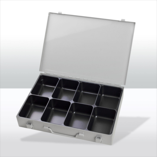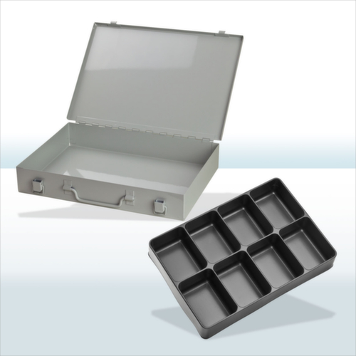 Verschließbar über 2 Spannverschlüssen. Ausgestattet mit herausnehmbarer Unterteilung. Mit Tragegriff. Koffer aus Stahlblech / Kästen aus Kunststoff. Koffer mit schlag- und kratzfester Pulverbeschichtung in RAL7035 Lichtgrau. Kästen in schwarz.