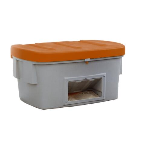 Aus schlagfestem Polyethylen. Ausgestattet mit schnell und einfach demontierbarem Klappdeckel - ganz ohne Werkzeug. Abschließbar: dank Einhängekonstruktion an Deckel und Korpus kann wahlweise bequem ein Vorhängeschloss angebracht werden. So ist stets ein Schutz vor unbefugtem Zugriff erreichbar. Behälter grau, Deckel orange. Wände geschlossen mit praktischer Entnahmeöffnung. Dadurch lässt sich Material einfach entnehmen, ganz ohne dass der Deckel geöffnet werden muss. Boden geschlossen. Mit offenem Deckel ineinander stapelbar.