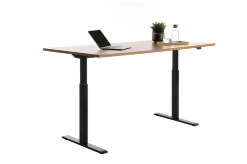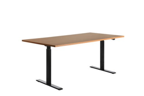 Platte aus Spanplatte mit pflegeleichter Melaminharzbeschichtung in Dekor Buche. Plattenform rechteckig. T-Fußgestell in schwarz. Höhenverstellung durch 2 Elektromotoren unterstützen Sie bei einer komfortablen Höhenverstellung auf Knopfdruck. Funktionen: Abspeichern und automatisches Abrufen von programmierten Tischhöhen dank Memoryfunktion. Der automatische Kollisionsschutz stoppt sofort bei Widerstand von oben oder unten und sorgt somit für absolute Sicherheit.