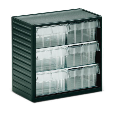 Gehäuse aus bruchsicherem Polypropylen / Schubladen aus schlagzähem Polystyrol. Schubladen in transparent. Schubladenboden gewellt zum leichteren Greifen kleiner Artikel. Böden aus Stahl, mit korrosionsschützender Zinkbeschichtung.