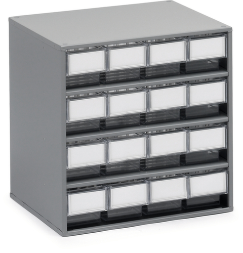 Gehäuse aus Stahl mit schlag- und kratzfester Pulverbeschichtung in RAL7035 Lichtgrau / Schubladen aus bruchsicherem Polypropylen. Schubladen in grau. Schubladenboden gewellt zum leichteren Greifen kleiner Artikel. Zum Aufhängen an der Wand oder frei aufstellbar.