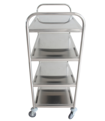 Etage(n) aus Edelstahl mit Abrollrand. Edelstahlkonstruktion. Leicht zu manövrieren und verfahren durch 4 Lenkrollen, Feststeller an zwei Lenkrollen gewähren bei Bedarf stets einen sicheren Stand. Rad Ø 100 mm. Räder mit bodenschonender Gummi-Bereifung. Radanordnung parallel.