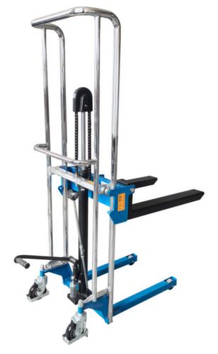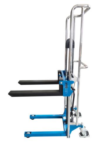 Lenkräder mit Polyurethan-Bereifung, Breite x Ø 35 x 125 mm. Gabelrollen mit Polyurethan-Bereifung, Breite x Ø 32 x 75 mm. Gabeln aus Stahl mit schlag- und kratzfester Pulverbeschichtung in schwarz. Verwindungssteife Stahlkonstruktion. Bedienung Hub über Fußpedal. Mit Hydraulikpumpe für einen kraftvollen und stets zuverlässigen Hubvorgang. Kolben verchromt.