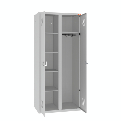 Links ausgestattet mit 4 Böden, rechts mit 1 Hutboden und Kleiderstange. Über die Doppelflügeltür ist der Zugriff auf den Schrankinhalt besonders komfortabel. Die aufschlagenden Türen bieten den Vorteil, dass es im Schrank keinerlei Platzverlust gibt, da sie innerhalb des Schrankes keinen Platz einnehmen. Verschließbar mit Drehriegelverschluss. Abteile gemeinsam verschließbar. Die standardisierte WEMO-Perforation sorgt für optimale Luftzirkulation im Schrank. Der untergebaute Sockel sorgt dafür, dass das Gewicht des Schrankes gleichmäßig auf dem Boden verteilt wird. Dies erhöht die Stabilität und der Schrank kann schwerer Lasten aufnehmen, als ein Schrank mit Füßen. Außerdem können Schmutz, Staub und Feuchtigkeit nicht unter den Schrank gelangen, was die Reinigungsfläche verkleinert. Konstruktion aus Stahlblech. Korpus mit korrosionsfester Zirkoniumbeschichtung in RAL7035 Lichtgrau, Front mit korrosionsfester Zirkoniumbeschichtung in RAL7035 Lichtgrau.