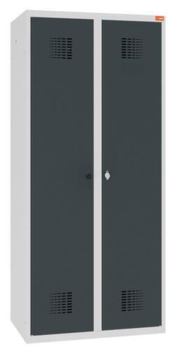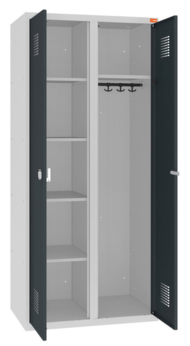 Links ausgestattet mit 4 Böden, rechts mit 1 Hutboden und Kleiderstange. Über die Doppelflügeltür ist der Zugriff auf den Schrankinhalt besonders komfortabel. Die aufschlagenden Türen bieten den Vorteil, dass es im Schrank keinerlei Platzverlust gibt, da sie innerhalb des Schrankes keinen Platz einnehmen. Verschließbar mit Drehriegelverschluss. Abteile gemeinsam verschließbar. Die standardisierte WEMO-Perforation sorgt für optimale Luftzirkulation im Schrank. Der untergebaute Sockel sorgt dafür, dass das Gewicht des Schrankes gleichmäßig auf dem Boden verteilt wird. Dies erhöht die Stabilität und der Schrank kann schwerer Lasten aufnehmen, als ein Schrank mit Füßen. Außerdem können Schmutz, Staub und Feuchtigkeit nicht unter den Schrank gelangen, was die Reinigungsfläche verkleinert. Konstruktion aus Stahlblech. Korpus mit korrosionsfester Zirkoniumbeschichtung in RAL7035 Lichtgrau, Front mit korrosionsfester Zirkoniumbeschichtung in RAL7016 Anthrazitgrau.