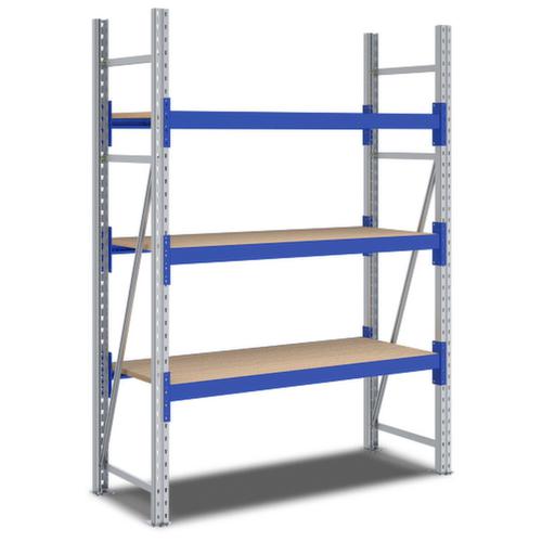 Die wichtigsten Maße des Weitspannregals auf einen Blick:3 Ebene(n) mit Holzboden. Fachhöhen je nach Einsatzzweck und Ihrem Bedarf im Raster von 50 mm verstellbar. Konstruktion aus Stahl, Ständer mit korrosionsschützender Zinkbeschichtung, Traversen mit strapazierfähiger Kunststoffbeschichtung in RAL5010 Enzianblau. Ständer mit Fußplatte (dübelfähig).