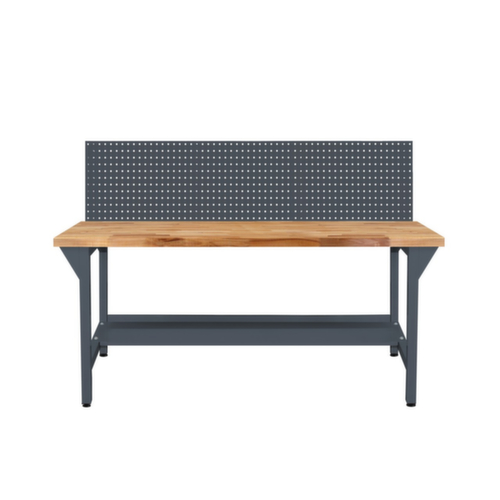 4-Fußgestell. Ausstattung: 1 Ablageboden unter der Tischplatte und 1 Lochplatte als Aufbau. Bei gleichmäßiger Belastung ist der Ablageboden bis 60 kg belastbar. Konstruktion aus Stahl. Gestell mit schlag- und kratzfester Pulverbeschichtung in RAL7016 Anthrazitgrau. Lochplatte in RAL7016 Anthrazitgrau. Die Holzplatte ist riegelartig verleimt und somit hoch stabil.