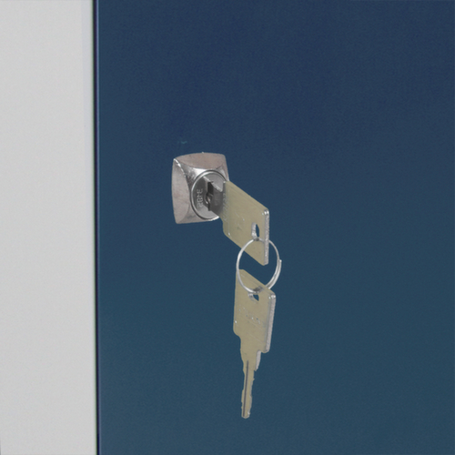 4-Fußgestell. Ausstattung: 2 Schränke. Flügeltür. Verschließbar mit Zylinderschloss. Konstruktion aus Stahl, verschweißt. Gestell mit schlag- und kratzfester Pulverbeschichtung in RAL7035 Lichtgrau. Front mit schlag- und kratzfester Pulverbeschichtung in RAL7016 Anthrazitgrau.